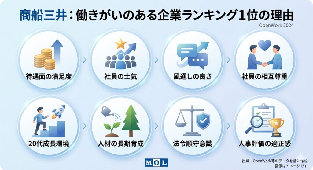 その理由は、商船三井が「働きがいのある企業ランキング」で1位になったことにあります。