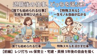 5年後の退職を見据え、その後の働き方を考察。スーパーのレジ打ち等の「誰でも始められる仕事」の魅力と限界、保育士や宅建等の「特殊スキル」を持つメリットを比較します。子育て中で時間がなくても、自分の好き嫌いにアンテナを立てる大切さを伝えます。※2本立ての1回目。
