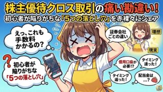 株主優待を低コストでゲットできるクロス取引。でも「全銘柄対象?」「特定口座でOK?」など疑問も多いはず。私が初挑戦で冷や汗をかいた5つのポイントと、貸株料によるコスト負けを防ぐ考え方をまとめました。次回、寿スピリッツの実践編へ!
